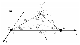 前向散射雷达成像系统结构如图 15所示,在大衍射角信号模型中,对目标侧影轮廓上任一点的收发斜距rR,T作如下近似表示: