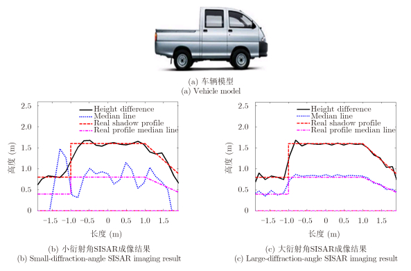 4.3 SISAR成像验证考虑到收发不同步的情况下利用包络检波方法一般只能提取单通道回波信号[4],并不适用于SISAR成像,因此早期关于SISAR成像的验证都是基于仿真开展的。为保证仿真结果的精确性和有效性,一般情况下都采用未经近似处理的菲涅尔-基尔霍夫衍射模型构造回波信号,并进一步利用回波信号进行SISAR成像。图 16给出了一组车辆目标的小衍射角SISAR成像与大衍射角SISAR成像的对比结果[52],用于成像的信号对应接收方位角为–28°~28°。对比可以看出,在衍射角较大时,大衍射角SISAR成像算法可以精确恢复目标的高度差像和中线像,而小衍射角SISAR成像算法分辨率较低,中线像也出现了较大误差。