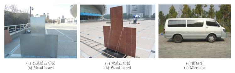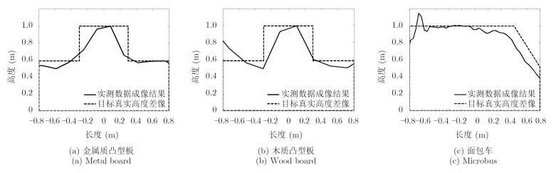 实验目标主要包括金属质凸形板、木质凸形板及面包车等,如图 17所示。考虑到包括检波只能提取单路实信号,因此在数据处理中采用了一种基于分段希尔伯特变换的复信号恢复方法[60],并利用恢复的正交复信号进行SISAR成像,其结果如图 18所示。由于目标中心相对天线的高度近似为0,因此只提取了高度差像结果。可以看出,所提取的高度差像和目标真实高度差像间有较强的一致性,验证了SISAR技术对运动目标成像和识别的作用。