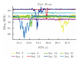 考虑到前向散射效应带来的强RCS可以弥补无源探测较弱的发射信号功率,利用导航卫星作为发射源,地面布置接收机构成前向散射配置来探测空中目标也是FSR的发展方向之一。最早的,德国的GmbH 公司的V. Koch和R. Westphal于1995年在IEEE上发表文章[12],提出使用全球导航卫星系统(GNSS)进行无源多基地探测。对所采集的4组实验信号数据的信噪比做了对比,实验目标为小型螺旋桨飞机和轻型喷气式飞机,分析结果表明所获得的散射信号与目标之间是相关的。2012年,德国弗劳恩霍夫集成电路研究所的研究人员发表了利用GPS信号探测空中目标的最新成果[13],实验利用GPS卫星作为发射机,利用右旋极化的半球天线作为接收机,在纽伦堡机场跑道附近的不同位置观测飞机穿越时的GPS前向散射信号。由于积累时间较短(处理间隔变短),其数据率较Koch的结果有所改善。分析结果表明,依据飞机穿越位置、卫星信号和接收位置的不同,接收信号会出现不同程度的衰减、提升或震荡。图 2是飞机穿越基线时同一位置接收到的不同卫星的前向散射信号,可以看出由于飞机的遮挡效应,可以明显观测到最大约30 dB的衰减,但同时也有一定提升产生,但最大不超过2 dB,这是由于飞机位置不同引起弗朗禾费衍射所导致。