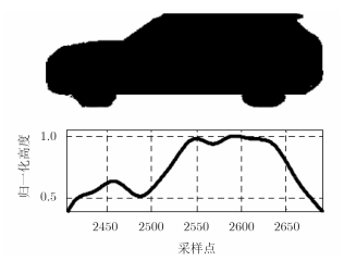 其中Ts为相参积累时间。在大衍射角成像算法中,由于精确补偿了目标中心点多普勒相位、目标轮廓长度二次相位以及目标沿基线方向运动速度引入的相位,得到的复轮廓函数的相位可以精确地反映目标中线高度信息,这使得FSR可以精确提取地面运动目标的中线高度像。在大衍射角SISAR成像算法的基础上,针对非垂直穿越目标轮廓投影面不与基线垂直的问题,文献[53]提出了一种改进的大衍射角SISAR成像方法,可以对非垂直穿越目标更精确地恢复轮廓像;针对地面运动目标成像中存在的多径干扰问题,文献[54]研究了多径干涉对目标前向散射RCS的影响以及对应的地面运动目标SISAR成像方法,并给出了车辆等地面目标的成像结果。