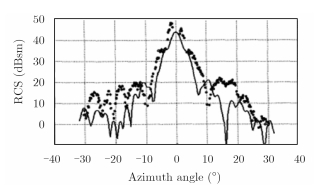 其中,k为波数矢量,ρ为目标侧影平面的坐标矢量,ds为微分表面积。当双基地角等于180°时,式(2)就退化为式(1)。式(2)表明,前向散射RCS随角度的变化与相同形状且均匀照射的天线方向图相同。随后,J. I. Glaser在1989年也给出了一些双基地在180°时的实测前向散射RCS结果[33]。1999年,A. B. Blyakhman等首次公开发表了真实飞机的前向散射回波功率的实测结果[8],如图 5所示,其中点线表示根据实测回波信噪比换算得到的RCS,实线表示利用式(2)得到的仿真值。
