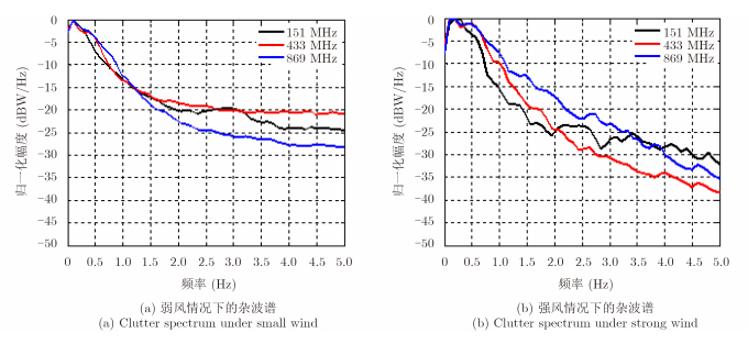对谱特性,通过对不同风速、频率杂波功率谱的分析发现了前向散射情况下杂波的谱扩展对风速极不敏感这一特殊现象,风速的增加主要是对杂波强度的影响较大;并且同样的风速情况下,杂波的谱扩展与载波频率也不再是载波频率之比的比例关系,杂波的谱扩展也几乎相同,只有在强风的时候略有差异不同强度的杂波谱信号几乎相同,也即杂波谱特性并没有随着风速的增加而成比例的增加。例如图 6中的实测数据处理完全看不到433 MHz载波频率下的杂波谱宽是151 MHz载波频率下的杂波谱宽3倍的结果。