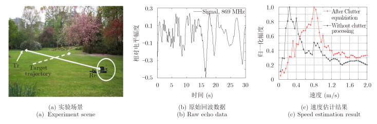 此外,基于功率谱模型拟合的方法对杂波信号的功率谱进行了估计,对比了各种经典的功率谱模型与真实杂波数据功率谱形状的差异,选定AR模型拟合实际功率谱密度函数;利用拟合的功率谱数学模型进行了杂波抑制的处理,而实测数据的处理结果充分地验证了杂波抑制方法的有效性。图 8给出了一组经过杂波抑制处理的目标运动速度估计结果,实验目标为人,载波频率869 MHz。可以看出,在较高的载波频率下,杂波信号太强,目标信号完全被淹没。杂波抑制前和杂波抑制后的速度估计处理结果差异非常明显:在杂波抑制前,无法进行有效的目标速度估计,而在杂波抑制后,其速度估计曲线较为平滑,存在明显的峰值,并得到了精确的速度估计结果,充分表明了在高载波频率杂波抑制的必要性,也证明了估计的杂波功率谱模型的有效性。
