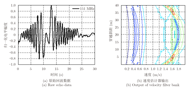 图 9给出了一组多参数联合非线性估计的结果。在实验的设计中,目标(人)垂直穿越基线,穿越点离发射机距离10 m,基线长度50 m,载波频率为151 MHz。从图 9中的处理结果可以看出,目标的估计速度为1.62 m/s,目标的穿越位置估计值为10 m和40 m,与真实值基本一致。多参数联合的估计方法能够精确地估计出目标的基线穿越位置,为沿基线方向提供一定的分辨能力奠定了基础。