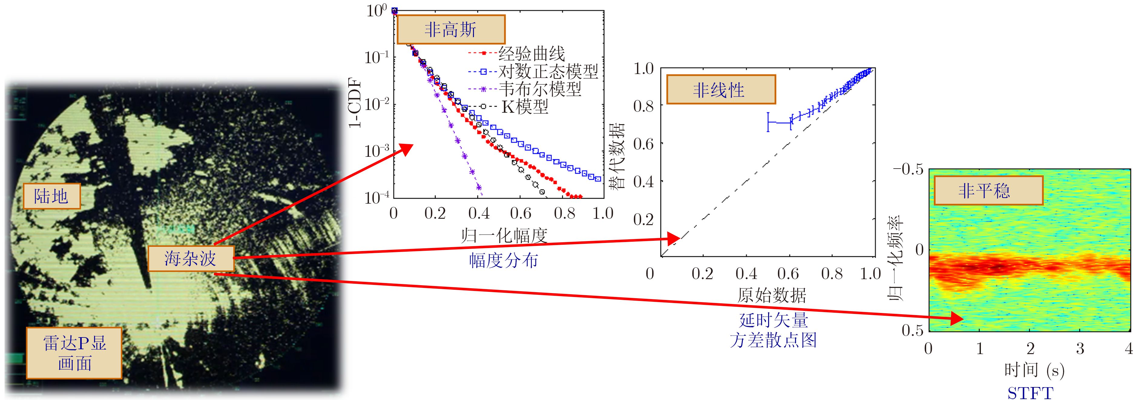 6 海杂波非平稳性与非线性认知海杂波特性认知的已有研究大多建立在平稳假设条件下,在该假设下,海杂波相关性分析、多普勒谱估计以及协方差矩阵估计等都可以采用较为简单的方法。然而,随着雷达分辨率的提高和海况等级的增加,平稳性假设条件很难满足,海杂波所表现出的复杂特性已经从非高斯扩展到非平稳和非线性[49, 50],文献[129]将其统称为海杂波的“三非”特性,如图 3所示。此时,仅采用常规统计学方法研究海杂波特性时会存在一定的局限性,需要对海杂波特性认知的理论和方法进行扩展和完善,以便于从更加深入的层次上认识和理解海杂波的复杂性及其电磁散射机理。