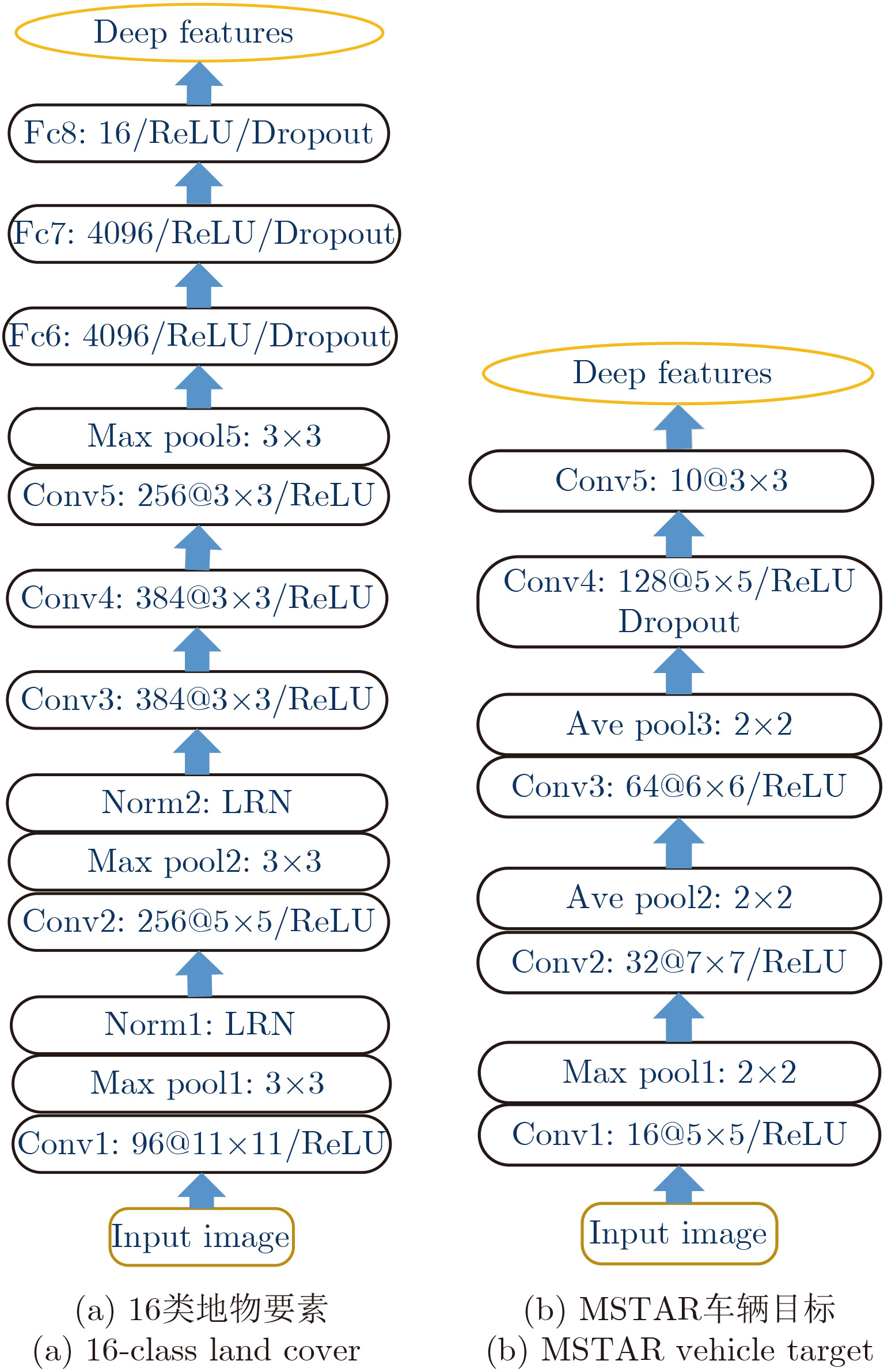 3.2.2 参数初始化本文将CNN作为一种特殊的特征学习方法,通过逐层线性或非线性映射从原始数据中提取图像的深度特征。图3(a)和图3(b)分别为16类地物要素和MSTAR数据集车辆目标的深度特征提取模块网络结构。图3(a)中“Conv1”、“Conv2”、“Conv3”、“Conv4”、“Conv5”层权值初始化为方差0.01的高斯分布,“Conv1”、“Conv3”层偏置设置为常数0, “Conv2”、“Conv4”、“Conv5”层偏置设置为常数1,“Norm1”、“Norm2”层局部窗口大小为5×5,缩放因子