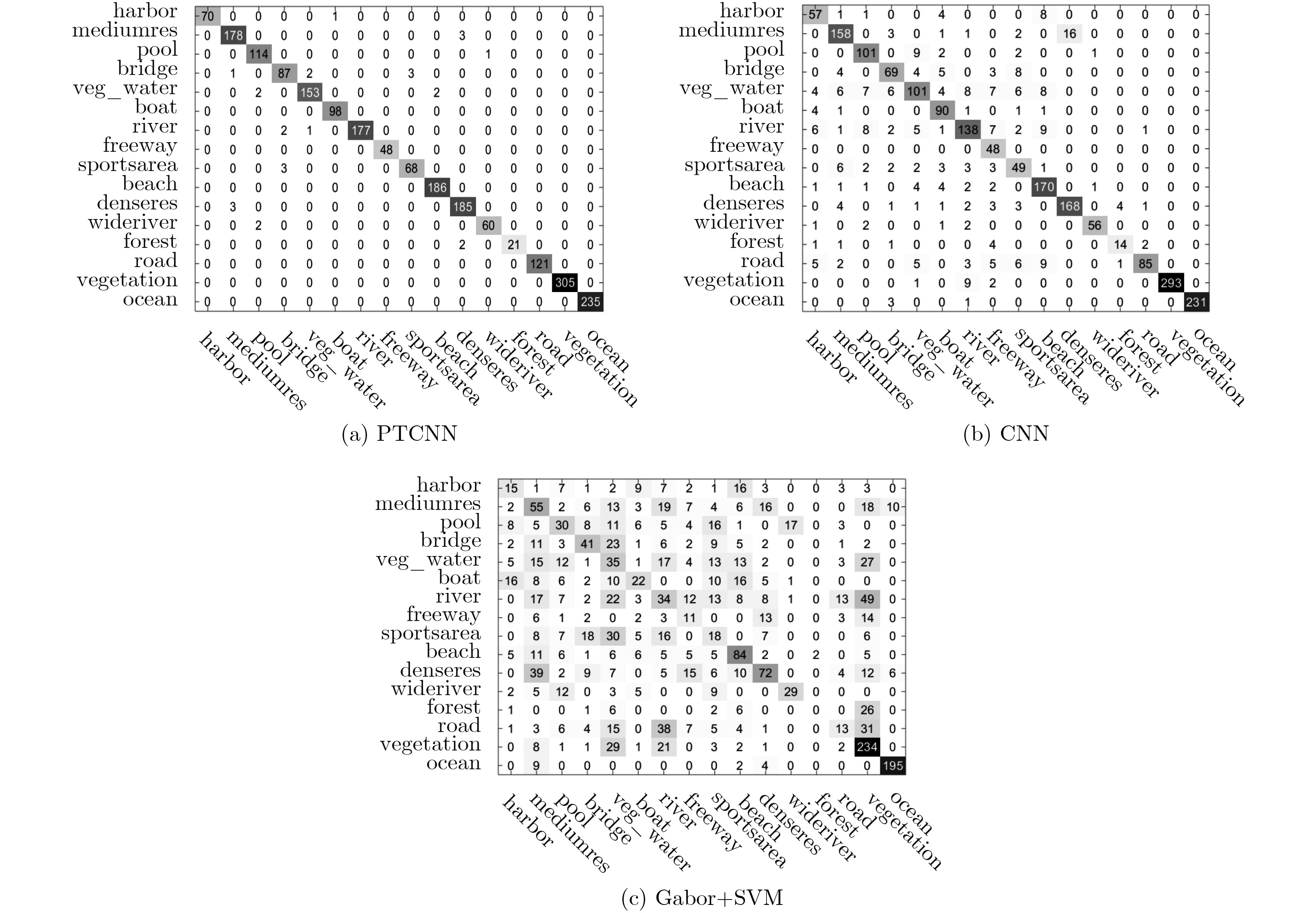 而由于SVM算法分类性能与特征选择密切相关,对于地物数据集,本文采用基于Gabor特征的SVM分类算法[20],这里提取的Gabor特征为48维(由4个方向、6个尺度下特征图的均值和标准差依次组成),SVM分类器采用RBF核函数,通过网格搜索法得到最佳误差项惩罚参数C=8000.0,最佳核函数系数