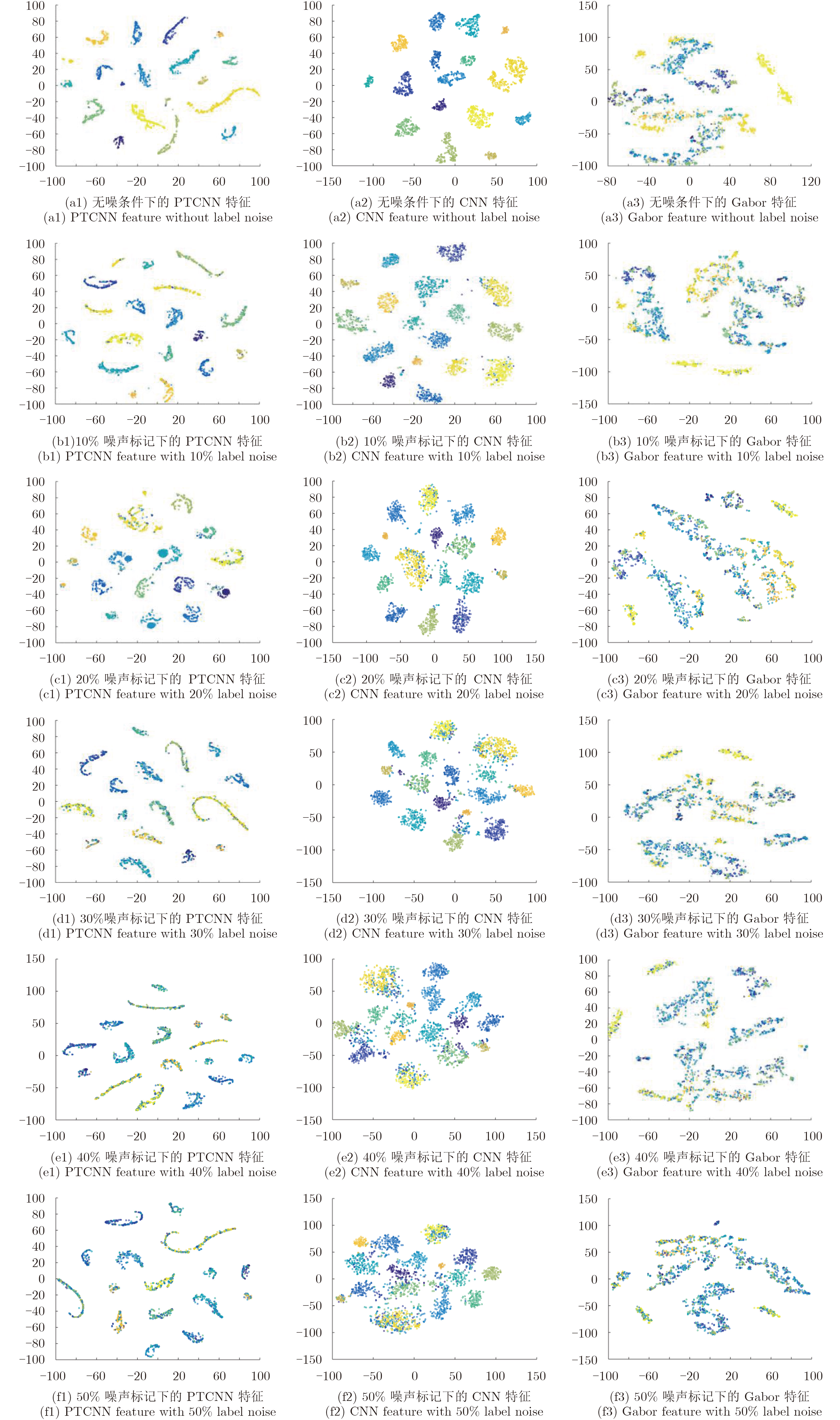 图5给出了含噪标记条件下SAR图像训练样本的PTCNN特征、CNN特征和Gabor特征,采用t-SNE (t-distributed Stochastic Neighbor Embedding)方法分别将其特征分布映射到2维空间中并可视化(3种方法在不同噪声比例下的特征分布如图6所示,图中不同颜色表示不同的含噪标记,不同聚类表示预测的不同标记)。从图6第1列图6(a1)~图6(f1)可以看出不同标记噪声比例下的错标样本都被重新归类,特征分布基本不随噪声比例变化而变化,从视觉上直观地验证了PTCNN模型较好的抗噪性能和分类性能。同样地,从图6中第2列图6(a2)~图6(f2)可以看出经典CNN特征受噪声影响较大,且特征的可区分性随标记噪声比例的增加越来越差。图6第3列图6(a3)~图6(f3)可以看出传统Gabor特征可区分性比深度特征差,且对噪声比较敏感。