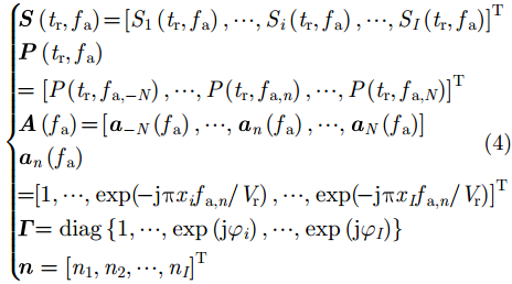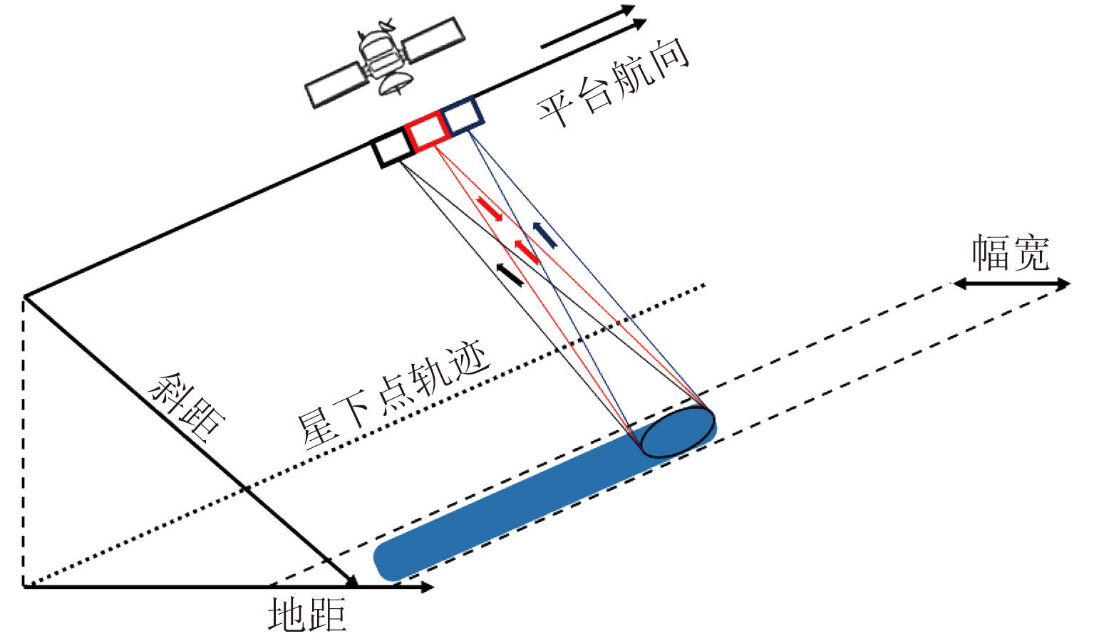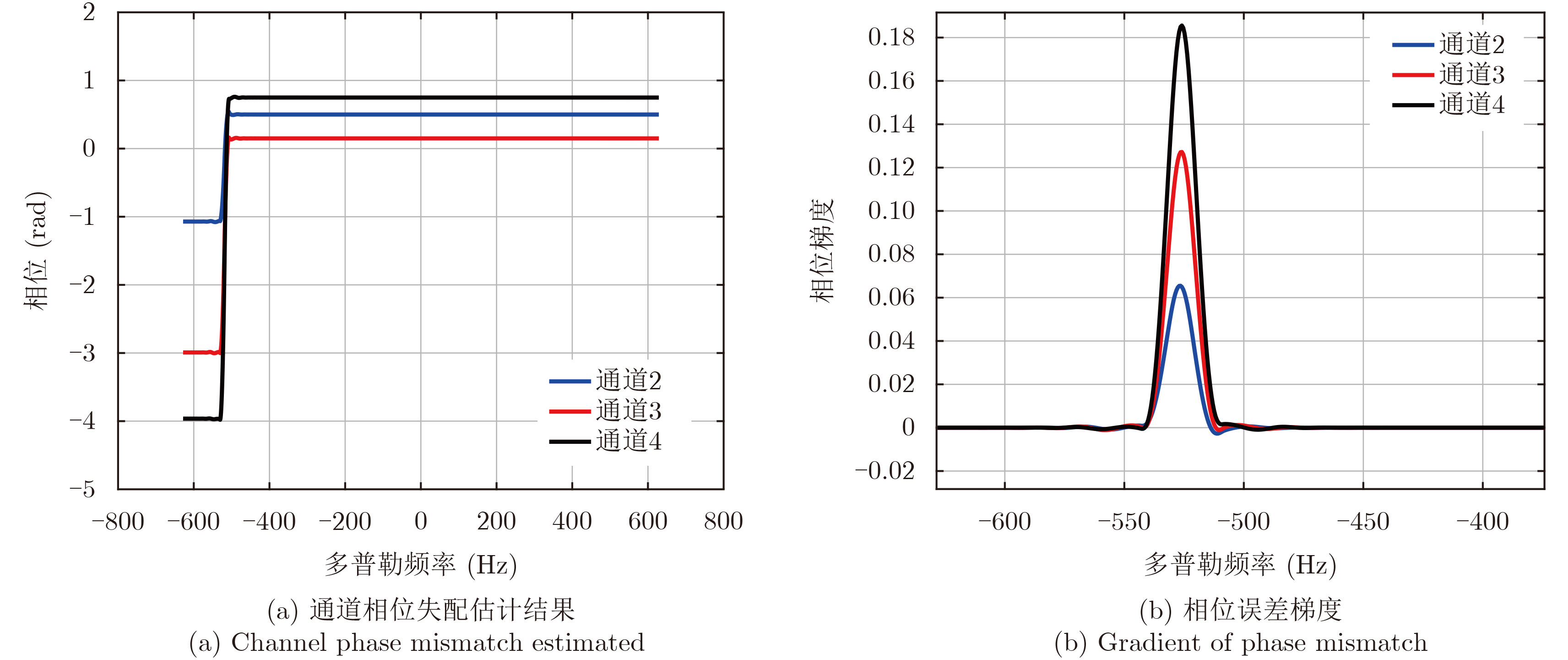 针对方位向多通道SAR系统中通道相位失配校正问题,目前已经有大量文献进行了相关研究。文献[2]在实际数据处理过程中采用了一种干涉相位直方图分析方法,补偿通道间的常数相位误差,方法简单,但是在精度上很难保证。文献[5–7]讨论了通道相位误差的多普勒维变化特性和距离向空变性,但是在算法推导和数据处理过程中并没有考虑波束斜视的影响。文献[8]从系统天线方向图与回波信号功率谱对应关系的角度出发,考虑基带多普勒中心的影响,通过方位互相关方法获取了通道间的距离向延时误差和空不变相位误差估计。在方位互相关方法中,系统基带多普勒中心的估计精度严重影响方位互相关方法的校正精度,然而基于存在多普勒模糊的单通道信号估计的多普勒中心存在较大误差。文献[9]和文献[10]从不同的角度推导了空域互相关方法,能够实现估计信号多普勒中心频率的同时校正系统相位误差,但是该方法依赖于通道间良好的相干性。文献[11]提出一种类似于空域互相关方法的相位失配时域估计方法,计算效率较高,但是循环相消的误差估计方法在通道数较多的情况下可能会造成估计误差累积。文献[12]提出一种基于多普勒谱优化的通道相位偏差估计方法,通过最优化方法获取重构多普勒频谱幅度主瓣最窄宽度对应的相位误差作为系统相位误差的最优估计。