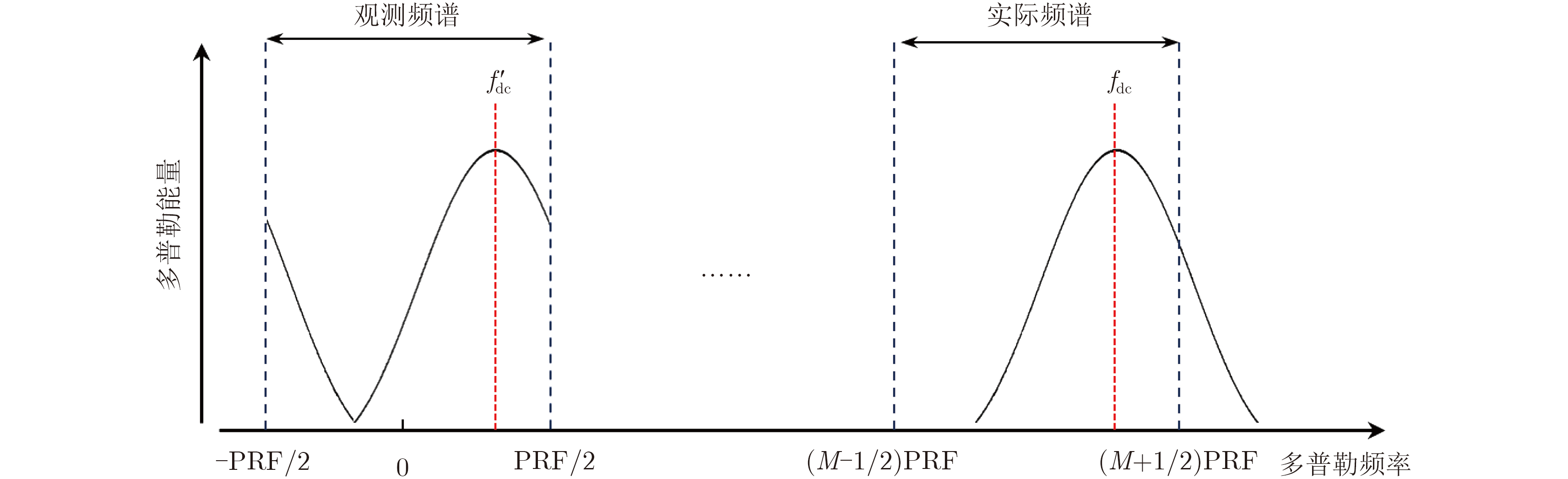 在系统运行过程中,SAR接收机在方位向以PRF采集回波信号。根据离散傅里叶变换理论,离散采样信号的频谱相当于将连续信号频谱在多普勒空间复制了无穷多次,SAR系统仅观测[–PRF/2, PRF/2]之间的部分。当天线波束指向偏离正侧视方向时,回波信号的多普勒历程较正侧视条件下偏移fdc,如图2所示。其中