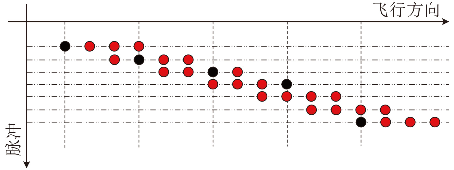 需要指出的是,该机载SAR系统采用了PRF地速跟踪技术。在方位多通道SAR系统中,方位采样的空间均匀性是影响系统性能(包括系统输出信噪比、方位模糊比)的重要因素,应该优化系统参数来保证良好的空间采样均匀性。为了实现每个通道空间上均匀采样(而不是获得均匀的时间采样),系统设置PRF随着飞行速度的变化实时调整。为了得到模糊的通道数据,我们对原始回波数据在方位向进行重采样,每隔6个空间采样脉冲保留一个采样脉冲,等价于将系统PRF降低为原来的1/6。重采样之后的数据每个多普勒频率单元模糊3次,构成的方位向四通道系统存在一个冗余通道。重采样过程在图4中表示,其中,红色圆点表示原始脉冲信号,黑色圆点表示重采样后的脉冲信号。