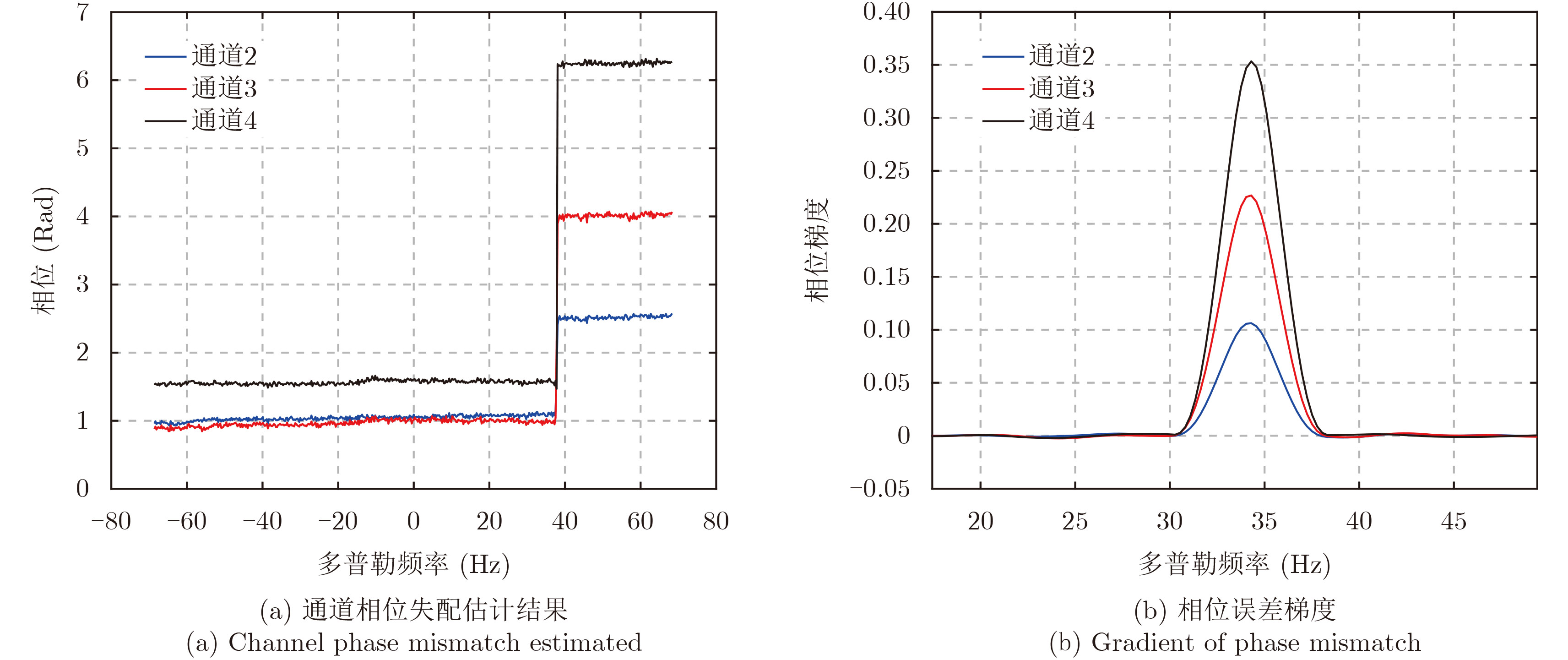 图3展示了仿真实验结果。图3(a)给出的是沿多普勒频率变化的相位失配估计结果。可以发现,当系统天线波束指向偏离正侧视时,3个通道的相位误差输出出现了不同程度的跳变。由于相位跳变的影响,在