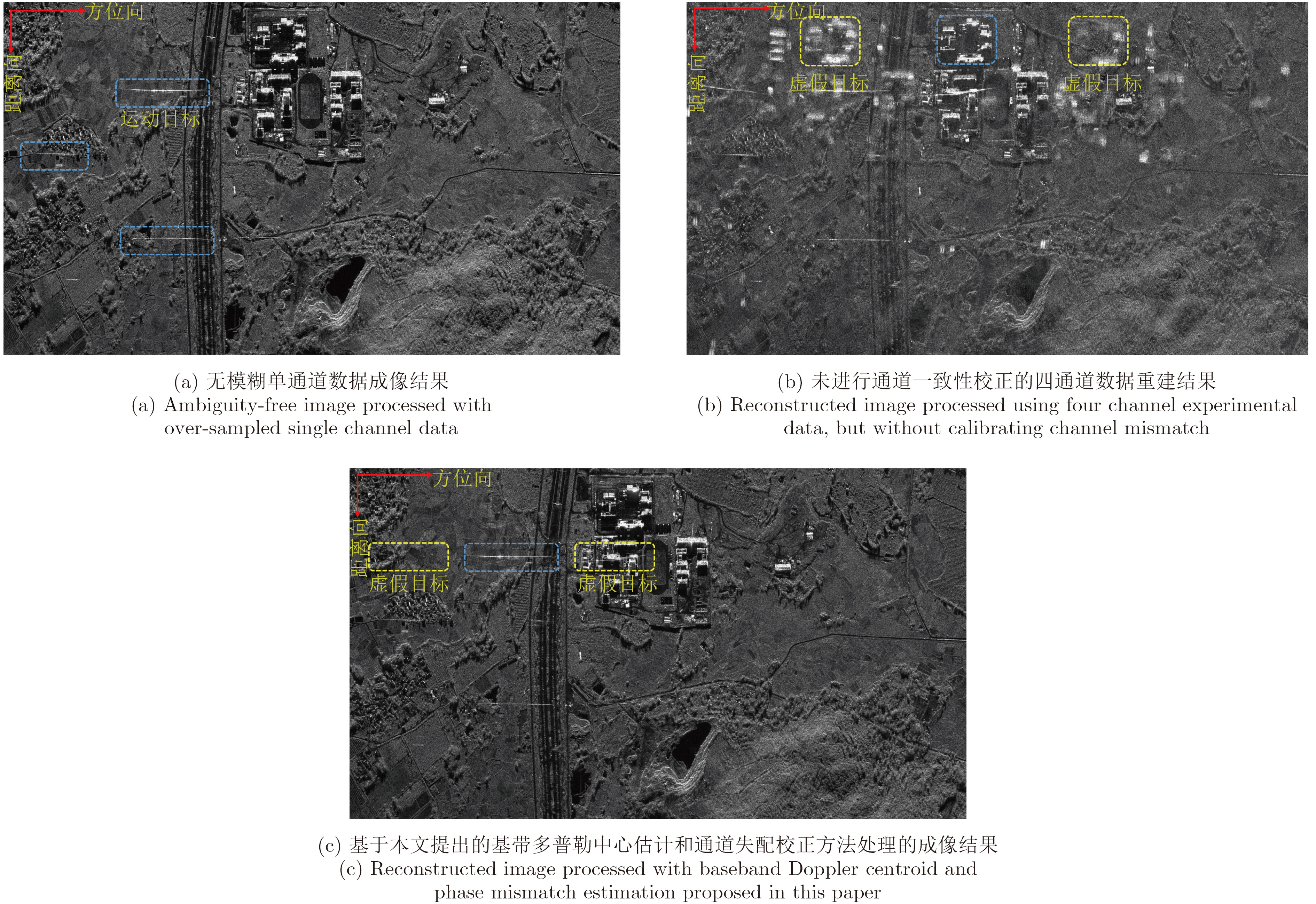 图6(c)展示了经过通道一致性校正和多通道信号重建处理的成像结果。可以发现大部分虚假目标得到了有效抑制,整体图像质量获得了很大提升。对比图6(b)和图6(c),两个结果均经过多通道数据重建,图6(b)中的虚假目标来自通道间误差。值得注意的是,重建滤波器能够有效抑制静止地物的虚假目标,而对运动目标无法进行有效重建。因此在获取的图像中仍然保留了运动车辆的虚假目标。方位向多通道高分辨率宽幅模式下的SAR运动目标检测与成像已经引起了广泛关注[19],也是我们下一步重点研究的方向之一。