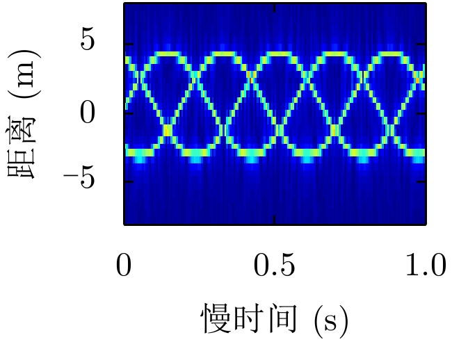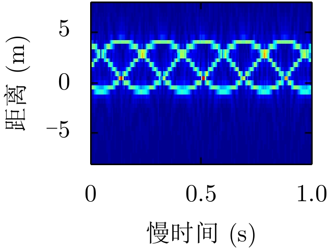 如前所述,在宽带成像雷达中,可以通过分析回波在1维距离像序列中的调制特征来获得目标的微动特征参数。HRRP是目标散射中心在雷达视线方向上的投影,微动对HRRP的调制影响主要表现为同一散射中心的分布、强度在HRRP序列间有规律地变化,这种对散射中心的周期性调制是基于HRRP序列提取微动特征的基础。通过采用Hough变换、Radon变换等方法提取距离-慢时间域上各微动散射点的径向微动历程,实现对空间微动目标锥旋周期[30,31]、进动角[32]与目标长度[31,33]等参数的估计。但是由于HRRP的方位敏感性、平移敏感性、强度敏感性、初相敏感性,特别是HRRP对目标姿态变化非常敏感,方位角每变化0.2°,就需要用一个新的距离像来表征目标[34]。因此,距离像序列长度不够时,估计得到的目标参数就极不稳健。此时基于连续长时间观测所获得的HRRP处理[33]或者基于多视角同时观测获得的HRRP联合处理[35],都能够获得目标真实可靠的微动特征。