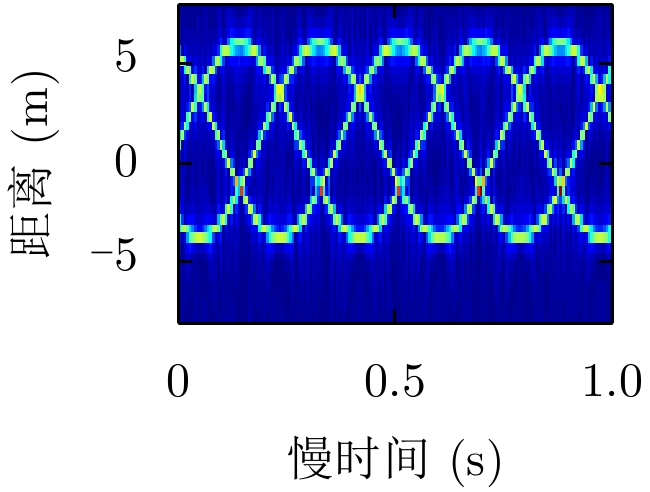 4.2 非刚体目标成像非刚体目标指目标与其部件之间存在独立于目标主体运动的相对运动。当雷达目标为非刚体时,目标回波为雷达观测时间内目标主体回波和微动部件回波叠加的多成分信号。由于微动部件与目标主体部分的运动特征不同,直接对目标进行成像,微动部件产生的微多普勒将会导致微动散射点所在的距离单元无法实现方位向聚焦,从而在所成图像中出现干扰条带[1]。当微动部件回波信号很强时,干扰会遮盖部分甚至大部分主体图像,严重影响成像质量。因此,早期的成像算法通常都是将微动部件的回波作为干扰从整体回波中滤除,但是这样损失了微多普勒信号中所包含的结构和运动特征等信息,不利于对目标进行全面准确的描述。