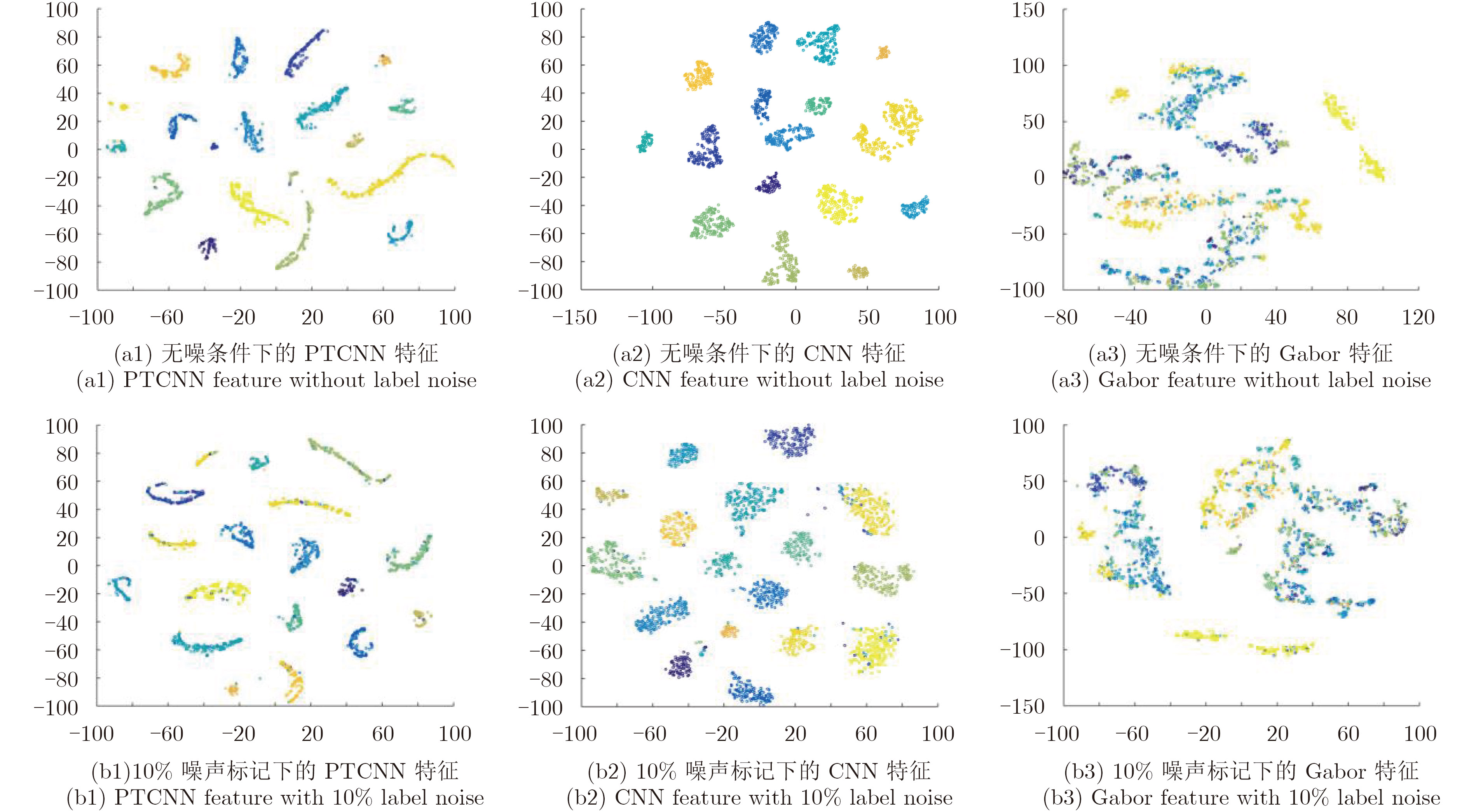 图5给出了含噪标记条件下SAR图像训练样本的PTCNN特征、CNN特征和Gabor特征,采用t-SNE (t-distributed Stochastic Neighbor Embedding)方法分别将其特征分布映射到2维空间中并可视化(3种方法在不同噪声比例下的特征分布如图6所示,图中不同颜色表示不同的含噪标记,不同聚类表示预测的不同标记)。从图6第1列图6(a1)~图6(f1)可以看出不同标记噪声比例下的错标样本都被重新归类,特征分布基本不随噪声比例变化而变化,从视觉上直观地验证了PTCNN模型较好的抗噪性能和分类性能。同样地,从图6中第2列图6(a2)~图6(f2)可以看出经典CNN特征受噪声影响较大,且特征的可区分性随标记噪声比例的增加越来越差。图6第3列图6(a3)~图6(f3)可以看出传统Gabor特征可区分性比深度特征差,且对噪声比较敏感。