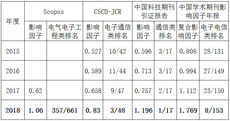 《中国学术期刊影响因子年报》影响因子1.769,无线电电子学、电信技术类153种期刊中复合影响因子排名第8位、影响力指数CI值排名第21位。