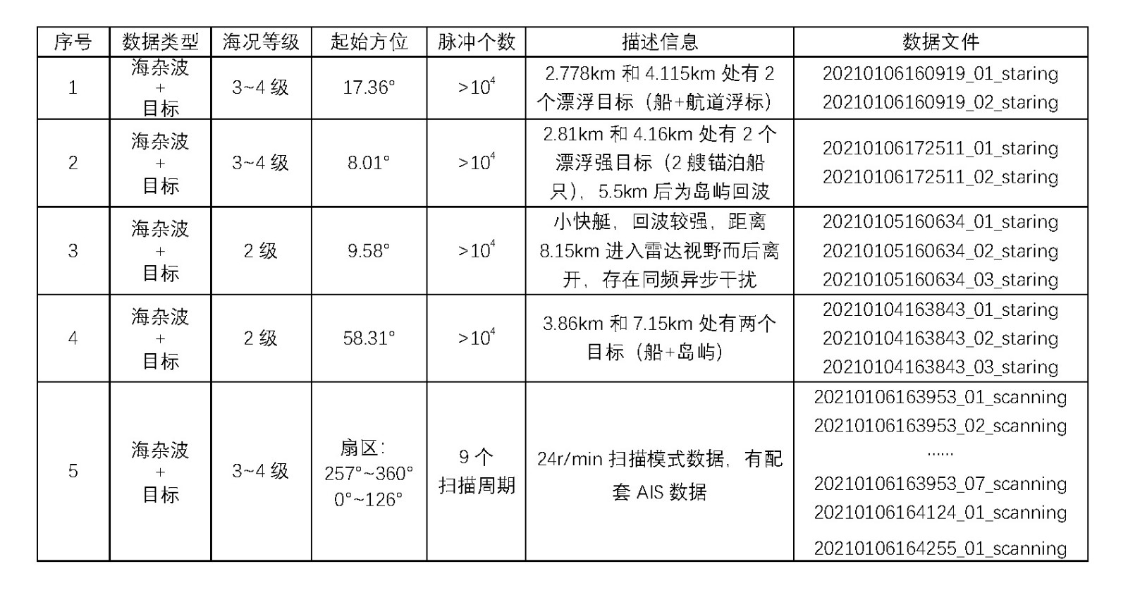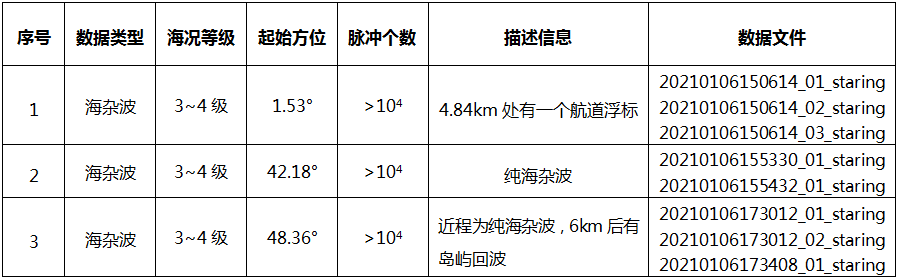 本期数据主要包括两组:海杂波数据、海杂波+目标回波数据,主要为凝视模式数据(仅1组数据为天线扫描模式数据)。由于试验时风速大,天线随风有轻微转动,角度较小,具体情况请见雷达数据头的“方位”信息位。下表中给出的海况等级较为粗略,详情可以以浪高信息为准。
