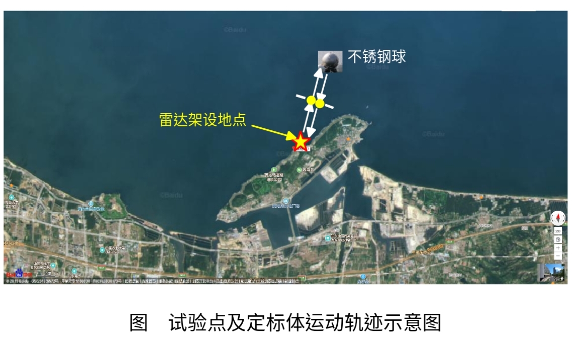 试验期间,雷达架设地点为烟台养马岛试验点,架高约为30米,渔船用尼龙绳拖拽不锈钢球沿下图中所示的航线慢速运动。不锈钢球放置在4个泡沫塑料浮子上,使其完全浮于海面以上,渔船与不锈钢球沿雷达径向的间距为100米以上,且二者在方位上也错开一定的角度。渔船在设定海上航线的部分位置点(见下图所示航线中的黄色圆点)处静止(漂浮),此时调整了雷达天线转速,采集多种转速条件下的雷达数据。试验期间综合判断海况等级为1级,更详细信息请见气象水文数据。